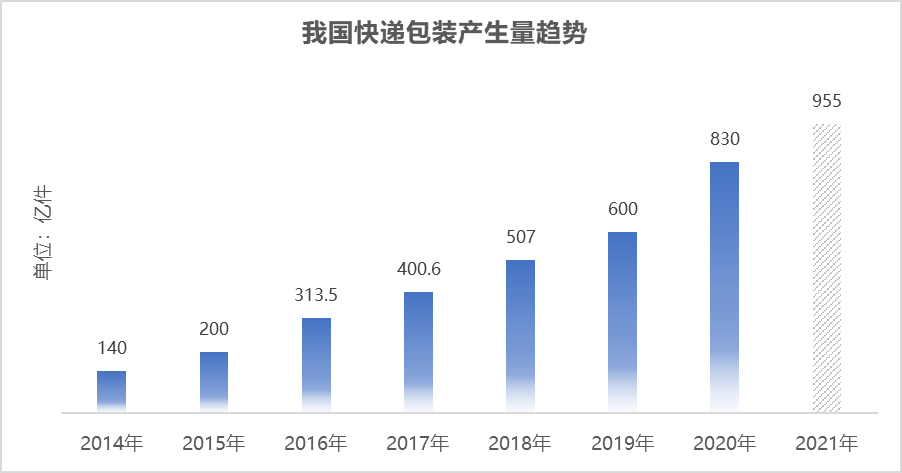 图:2014年-2021年我国快递包装产生量趋势图