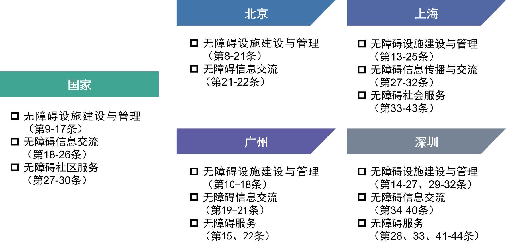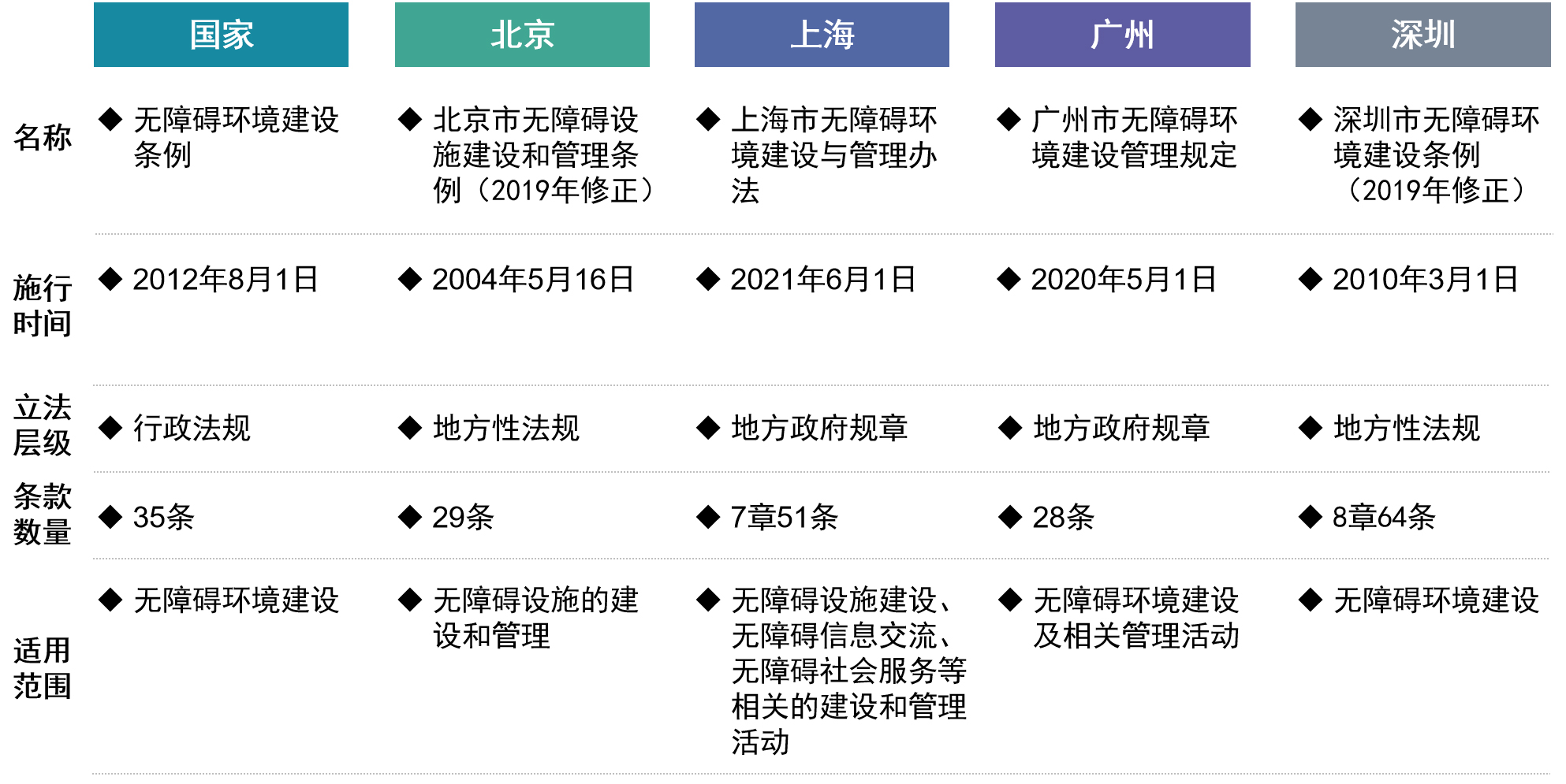 2012年8月1日,国务院颁发《无障碍环境建设条例》,实施近九年来,我国无障碍环境建设成就显著。根据上位法相关要求,各地逐渐建立、完善无障碍建设的地方性法规,为无障碍建设事业发展提供指导和强制性规范。为此,本文对北京、上海、广州和深圳四大一线城市(以下简称“北上广深”)的无障碍环境建设地方性法规进行比较分析,为北京市和国家层面完善无障碍建设法规提供参考。