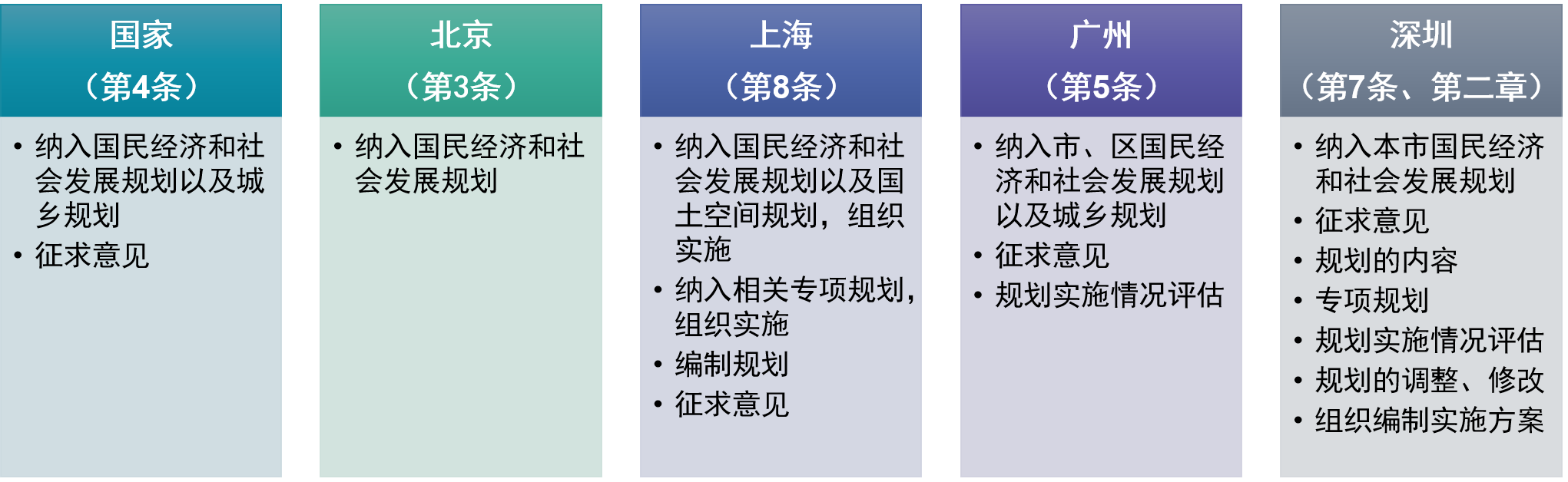 从条款数量来看,深圳、上海的法规内容丰富和详细程度相对较高,分别为八章六十四条、七章五十一条,广州和北京的篇幅相对较小,分别为二十八条和二十九条,少于国家条例的条款数量。