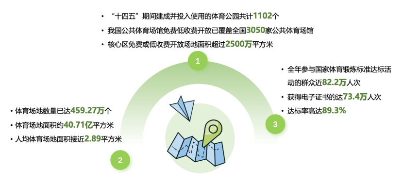 根据国家体育总局统计,我国体育场地数量已达459.27万个,体育场地面积约40.71亿平方米,人均体育场地面积接近2.89平方米,提前实现“十四五”人均场地面积目标(2.6平方米[ 该目标值为《“十四五”体育发展规划》中的目标。])。健身步道总长已达到37.1万公里,农民体育健身工程覆盖全国90%的行政村。全国各地大力兴建群众身边的健身场地,截至2024年6月底,“十四五”期间建成并投入使用的体育公园共计1102个,提前完成“十四五”目标任务。截至2024年底,我国公共体育场馆免费低收费开放已覆盖全国3050家公共体育场馆,覆盖近1600个县级行政区域,核心区免费或低收费开放场地面积超过2500万平方米[ 数据来源于:《体育总局办公厅关于进一步加强公共体育场馆 向社会免费或低收费开放管理工作的通知》]。2024年“国球进公园 国球进社区”活动覆盖社区9618个、公园1363个,配建乒乓球台23408张,配建其他健身器材25088(套)件[ 数据来源于:中国体育报报道]。