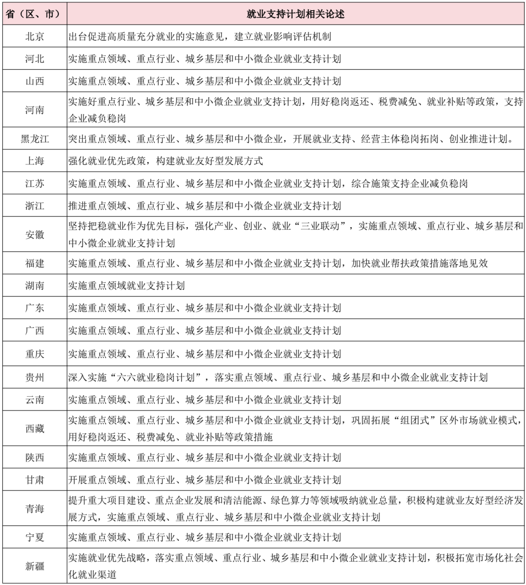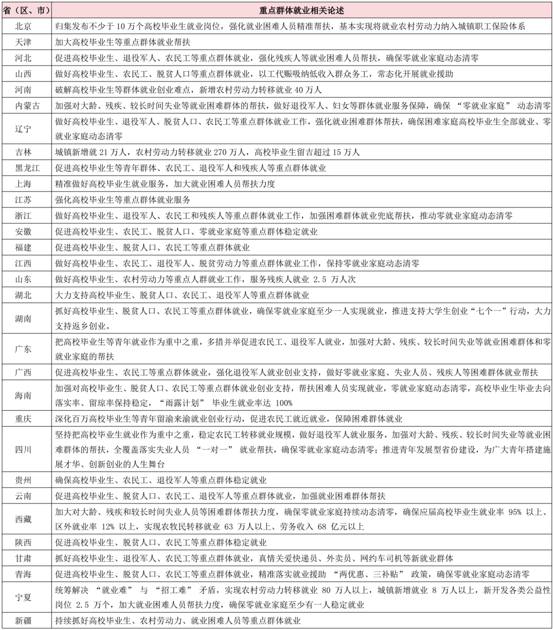重中之重,保障高校毕业生就业创业。31个省(区、市)全部提到了高校毕业生等重点群体的稳就业促就业工作部署,其中29个省份提到高校毕业生就业,充分体现出高校毕业生是就业稳定的重中之重,重庆、海南、湖南、北京和四川精准施策,各有亮点。重庆提出“深化百万高校毕业生等青年留渝来渝就业创业行动”;海南强调“保持高校毕业生毕业去向落实率、留琼率保持稳定”;湖南支持大学生返乡创业。北京强化精准施策,针对高校毕业生明确提出“归集10万个就业岗位;四川提出“推进青年发展型省份建设,为广大青年搭建施展才华、创新创业的人生舞台”。