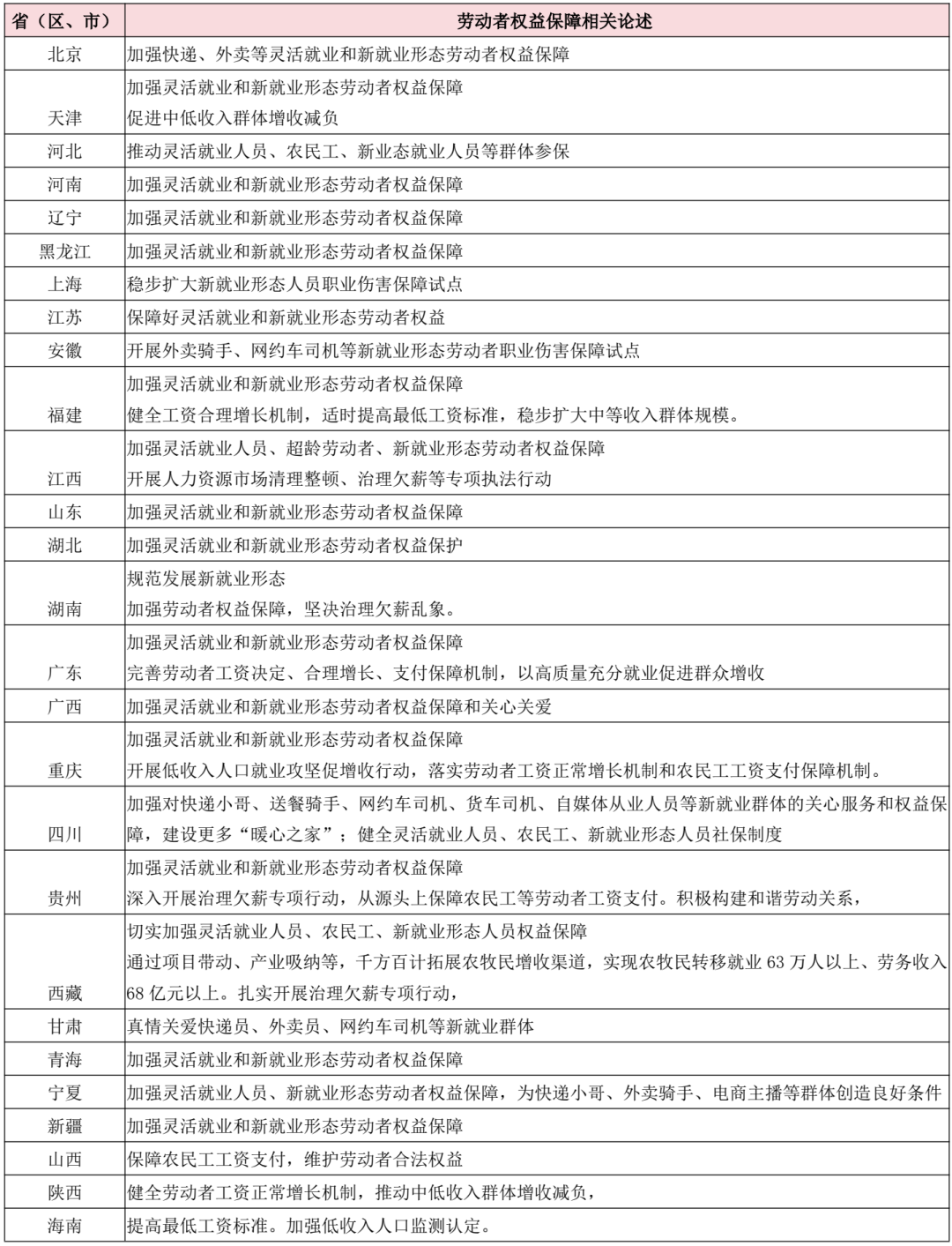 保障劳动者就业收入。本年度政府工作报告中,天津、福建、广东、重庆、山西、海南等6个省份提及“促进中低收入群体增收减负”“扩大中等收入群体规模”“完善劳动者工资决定、合理增长和支付保障机制”“提高最新工资标准”等任务。山西、湖南、重庆、贵州、江西、西藏等6个省份部署了治理欠薪,保障农民工工资支付重点任务。