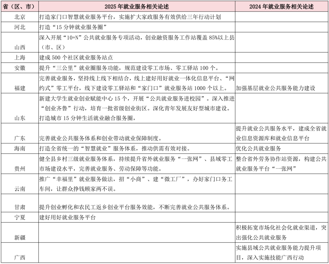 就业服务着眼基层站点新布局。就业服务对就业促进工作作用发挥更加显著,2025年13个省份布局就业服务相关工作,相比2024年的5个提升一倍以上。从整体任务部署看,2024年部署就业服务工作的省份主要开展健全就业公共服务体系,构建就业服务信息化平台等工作,而2025年度工作目标明确基层服务站点布局等具体工作。如山西提出“创业融资服务工作站覆盖85%以上县(市、区)”,上海提出“建成500个社区就业服务站点”,山东提出“新建15个大学生就业创业赋能中心”等。