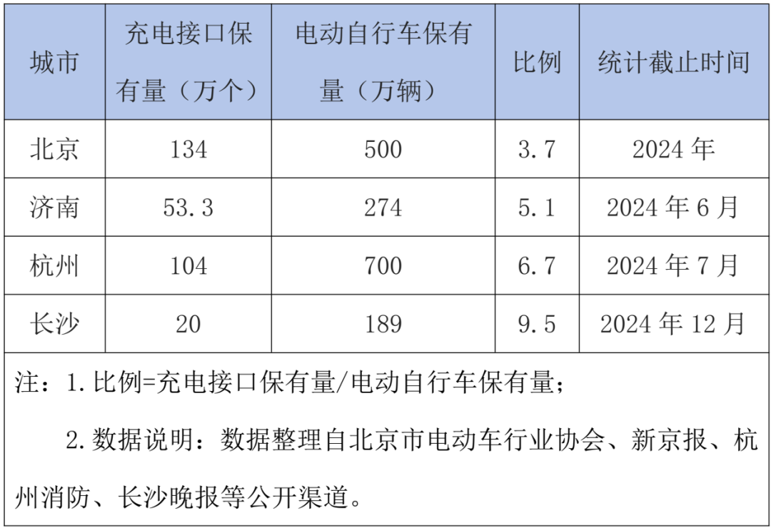 大部分城市要求充电接口与电动自行车保有量比例为1:3,以建设情况较好的北京为例,电动自行车保有量达500万辆,按1:3的比例需建设166万个充电接口,目前已建成134万个,完成率80.72%,仍存在一定缺口。类似情况在杭州、长沙等城市同样显著,其中杭州市2024年7月数据显示,104万个充电接口对应700万辆电动自行车,比例达1:6.7;长沙市189万辆保有量仅配备20万个充电接口,比例低至1:9.5。