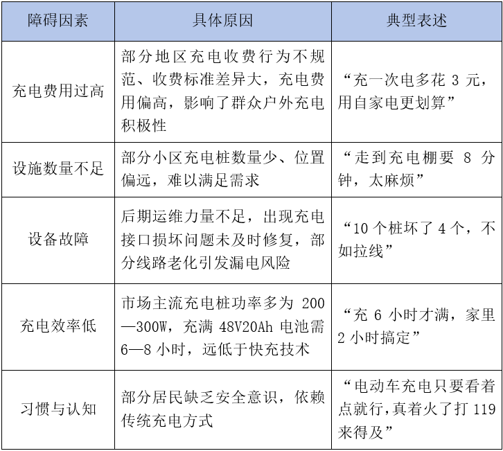 当前,全国电动自行车社会保有量已突破4亿辆,充电需求持续攀升,集中充电已成为解决电动自行车电池安全的主要方式。近年来,各地公共充电设施建设已取得阶段性进展,从相关采访和用户描述来看,居民充电行为的“路径依赖”仍未根本扭转,部分用户仍倾向于选择私充方式。设施建设滞后、经济性失衡、维护管理滞后等结构性矛盾持续弱化公共充电服务的吸引力。具体表现为充电收费溢价影响群众户外充电积极性,空间布局与使用需求错配形成物理使用屏障,设备运维滞后引发用户信任危机,而充电效率与用户预期的差距以及安全认知错位进一步削弱了使用意愿。