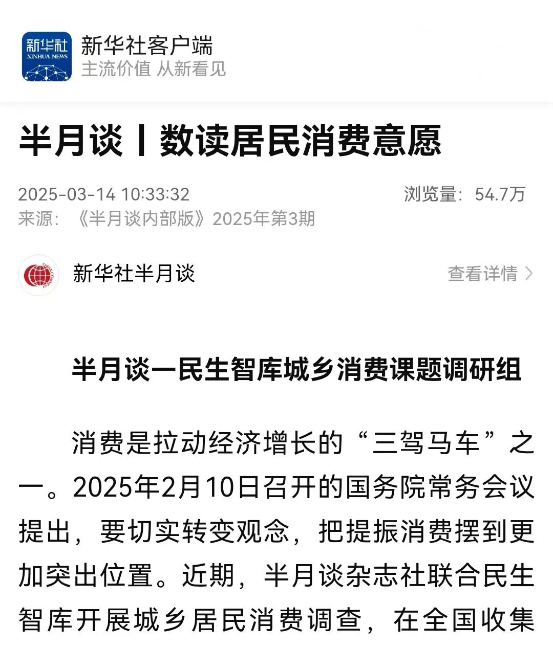 导读:3月12日,民生智库联合半月谈杂志社发布2025年城乡居民消费调研报告。从城乡居民家庭收支与消费信心、消费行为与场景、以旧换新政策拉动效果等方面进行深入调研,并针对调研结果,对提振群众消费、共筑满意安全消费环境提出四方面工作建议。报告已在新华社客户端、半月谈杂志、新华社经济参考报、人民日报中国城市网等媒体同步发布。如需获取报告全文,请联系我们。